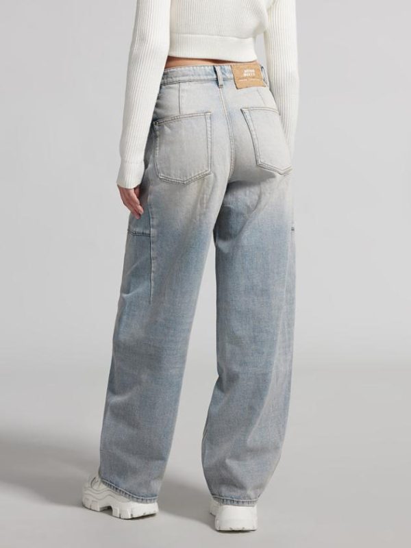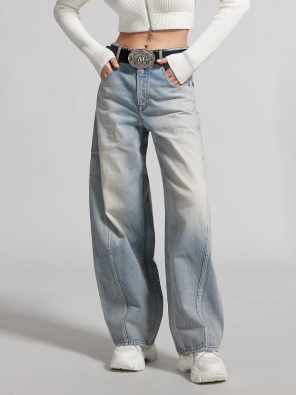 The denim fabric has a full and rich texture, a broad and sturdy silhouette, and undergoes multiple washes and craftsmanship to present a nostalgic denim style. The distressed and bleached design adds a vintage touch. The paper-like leather patch, combined with the brand’s embroidered logo, adds a unique and playful touch. The wide-leg design enhances a slim and elongated look for the legs.